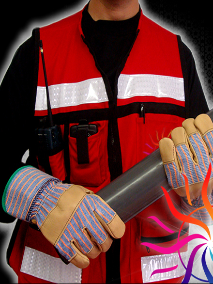 Guante de piel, fabricado para uso rudo, pensado para el montaje de bases y morteros de fuegos artificiales; con inserción de piel para reforzar el área de nudillos y protector de muñecas, ideal para mantener a salvo accesorios como relojes y pulseras manteniendo las manos limpias por más tiempo. Bordado con slogan.